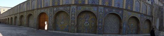 Wir starten schon um 08.00 Uhr zur Besichtigung des Golestan-Palastes. Schon Abbas I. hatte hier im 17. Jh. einen Park mit einem Palast errichten lassen. Anfangs des 19. Jh. liess Fath Ali Shah die Anlage zum Stadtpalast der Qadjaren ausbauen. Heute umfasst der Komplex mehrere Museen. Die ehemaligen Wohntrakte liegen am hinteren Ende des Gartens. Die Aussenfassaden sind mit farbigen Fliesen bedeckt, ein offener Saal mit Holzsäulen birgt einen kunstvoll gestalteten Marmorthron. Das Innere dieses Saales ist vollständig mit Spiegel Elementen und verzierten farbigen gläsern ausgestattet. Nach dem Verlassen des Marmorthrons wenden wir uns nach links. An der Ecke des Traktes öffnet sich dieser in eine von Säulen getragenen offenen Vorbau. Danach erreichen wir das Shams ol-Emarch, den ehemaligen Raum für Empfänge, über einen Treppenaufgang. Das Innere ist mit Verspiegelungen und Bemalungen prunkvoll gestaltet, in Vitrinen sind alte Koranhandschriften ausgestellt. Die ganze Anlage ist ein richtiger Prachtbau.