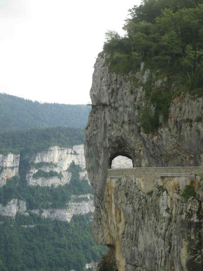 Durch lichten Wald geht es über den Col de la Machine (1.101), unspektakulär und eigentlich nur ein flache Kreuzung mit wenig Aussicht, dann stehe ich vor der berühmt - berüchtigten „Route de Combe Laval“, einer in den Fels gehauenen Straße mit einmaliger Streckenführung. In den Fels gesprengte Tunnel, kniehohe Mäuerchen zur Sicherung - nix für Hosenscheißer. Unter Überhängen hindurch und um Felsnadeln herum führt die nur 3 Km lange Straße scheinbar mitten durch den Fels. Also Atmung normal halten und Augen auf die Straße. Ich halte immer wieder an den Aussichtsstellen oder taste mich vorsichtig an die Begrenzungsmäucherchen heran, um einen atemberaubend Blick in den Abgrund zu riskieren. Bis zu 700 Meter stürzt die Felswand teilweise senkrecht nach unten. Da sollte man schon schwindelfrei sein. Einfach phantastisch! Nach Norden ergibt sich ein schier unendlicher, weiter Ausblick ins Rhônetal. Diese Traumpassage endet leider nach viel zu kurzer Zeit und schon bald erreiche ich über den Col du Gaudissart (840) Saint Jean-en-Royans, tief im Tal der Isère gelegen, ein. Hier lädt ein kleines Bistro zur Rast ein. Ich genieße die Sonne und schaue entspannt den Einheimischen beim Boule zu.