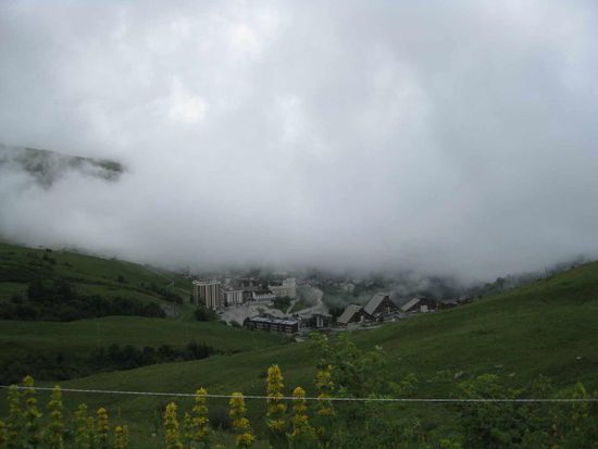 Unmittelbar hinter La Chambre geht es durch Felder auf einer einspurigen Straße steil und kurvenreich wieder nach oben. Schnell gewinne ich an Höhe und genieße schon bald einen tollen Blick über das weite Tal. Es folgt ein Waldstück mit mehreren Serpentinen und dann wieder einmal das Grauen - der sommerlich verlassene Retortenskiort St. Francois de Longchamps. Dazu passend Skipisten, soweit das Auge reicht. Da hilft nur Gas geben und durch. Den Rest der Strecke habe ich stets die Passhöhe im Blick. Die Straße schlängelt sich über baumlose, grünbraune Flächen zum Gipfel. Von hieraus habe ich einen grandiosen Ausblick auf das Mont Blanc Massiv (4.808) im Norden und den Col du Glandon im Süden.