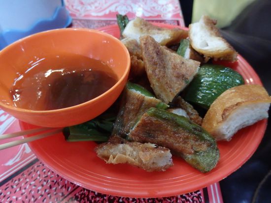 Kleine Zwischenmahlzeit... Keine Ahnung, was es genau war....Paprika, Bohnen und kleine Maiskölbchen mit Fleisch umwickelt und Brot, das in Ei gebacken war. Dazu ein milder Dip .... Sehr lecker.