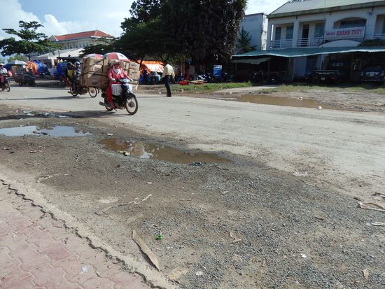 Die Fahrt von Sihanoukville bis zur Grenze war recht kurzweilig, in Kampot sind die letzten unserer Mitreisenden ausgestiegen, ab hier waren wir alleine im Bus. Es geht an Reisfeldern und Dörfern vorbei, je näher man der Grenze kommt, um so wilder sind die Roller und Motorräder bepackt! Autos sieht man kaum noch, hier wird alles aber wirklich alles mit Zweirädern transportiert.
