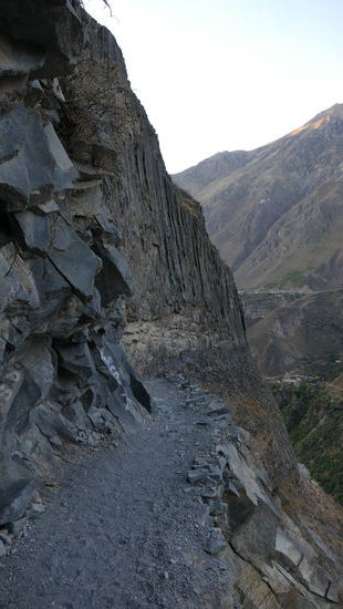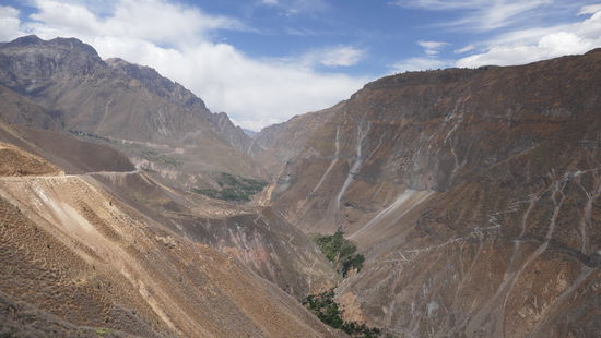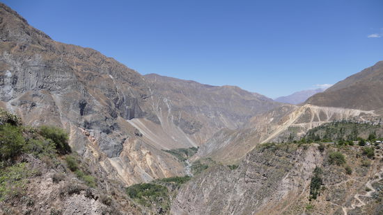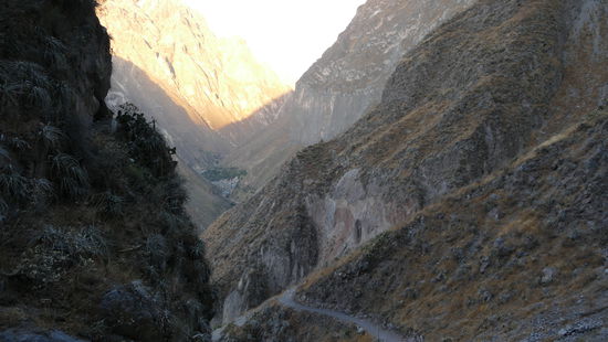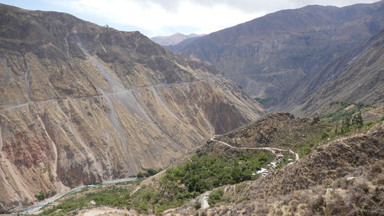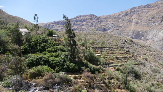 Am nächsten Morgen nahm ich den Bus nach Cabanaconde mit Zwischenstopp in Chivay. Während in den ersten vier Stunden bis nach Chivay die karge peruanische Pampa die Szenerie rund um unseren Bus bestimmte, waren die Landschaftseindrücke auf dem zweiten Teilstück wesentlich schöner. Als ich in Cabanaconde ankam, schulterte ich auch direkt meinen Rucksack und lief in den Canyon hinein. Da mein Bus erst gegen 16 Uhr ankam und es bereits um 18 Uhr dunkel wurde, musste ich die 1000 Höhenmeter schneller hinabsteigen als ursprünglich geplant. Bei Einbruch der Nacht erreichte ich schließlich meine Unterkunft in San Juan de Chuccho, wo es vor dem Schlafengehen noch eine fangfrische Forelle aus dem Colca-Fluss gab.