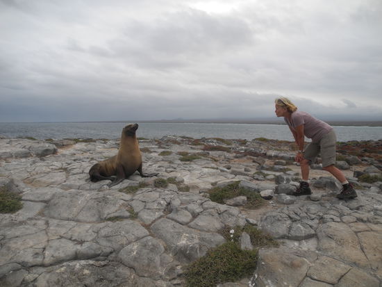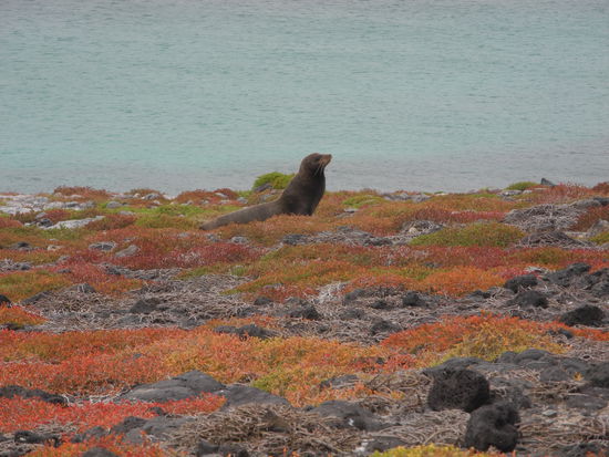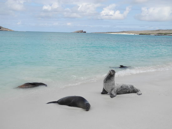 Danach war wieder schnorcheln angesagt, wir sehen fünf Riesenschildkröten in schwarz und weiß. Die Seelöwen spielen mit uns unter Wasser.
