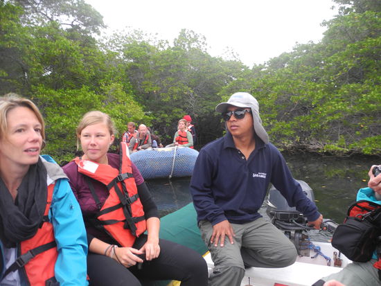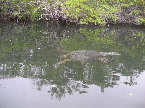 Heute gehen wir früh zu Bett, denn morgen steht um 6:00 Uhr noch der letzte Ausflug auf dem Programm. Mit dem Zodiak fahren wir zur Mangrovenbucht Caleta Tortuga, wo sich die Wasserschildkröten zur Paarung einfinden. Es geht durch eine kleine Öffnung in die Bucht, wo sich auch noch Haie und Rochen aufhalten.