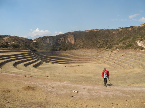 In eine große Erdmulde wurden unterschiedliche Ebenen kreisförmiger Terassen geschnitten, wobei jede Lage ihr eingens Mikroklima hat, je nachdem, wie tief sie liegt. Möglicherweise wollten die Inca die optimalen Bedingungen für die verschiedenen Pflanzenarten herausfinden.