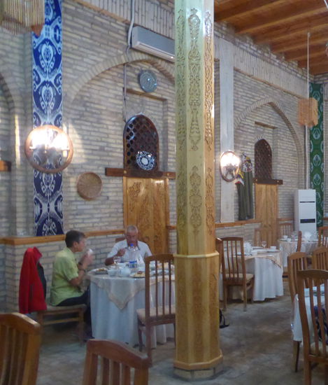 Um 19.00 Uhr folgen wir Herrn M. durch die Altstadt bis zum dem Restaurant, das an unseren bestiegenen Islam Khoja Minaret liegt. Heute gibt es dort die üblichen Vorspeisen, wieder eine Suppe ähnlicher Bauart und Dimlama – gekochtes Rindfleisch mit diversen Gemüsen und viel Knoblauch und Koriander. Danach wie üblich die Melonenstücke und Grünen Tee.