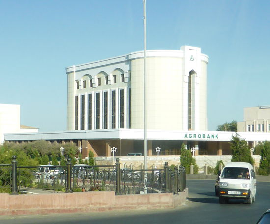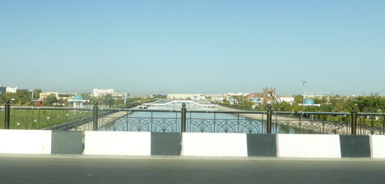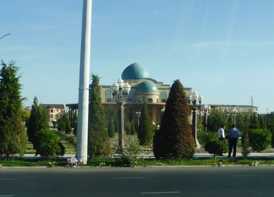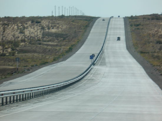 Herr M. hatte es schon angekündigt: es wird eine lange Fahrt. Wir verlassen Chiwa über den dekorierten Kreisverkehr, fahren wieder durch Urgansch mit seinen weißen Prachtbauten.