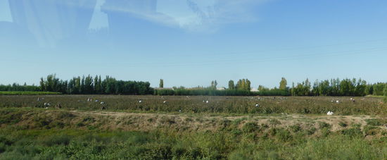 Kurz hinter der Stadt passieren wir bewässerte Felder, deren Einsaat ich nicht erkennen kann. Reis ist es jedenfalls nicht, in den Baumwollfeldern wird geerntet und am Straßenrand gibt es wieder das riesige Angebot an Melonen gesichtet.