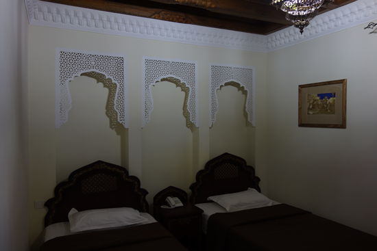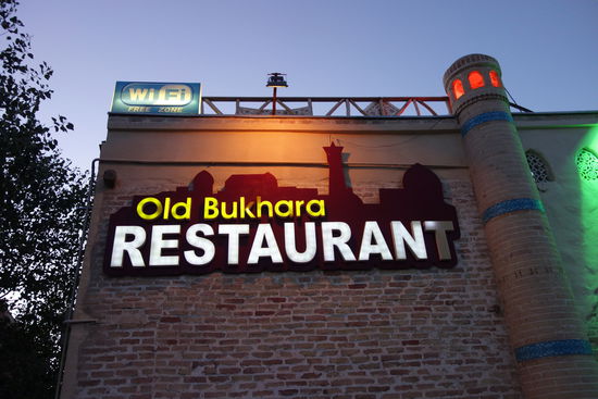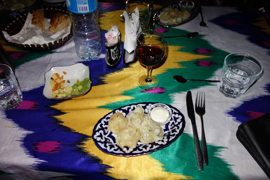 Nach dem Zimmerbeziehen treffen wir uns um 19.00 Uhr, um zu Fuß (!) zu einem Restaurant zu gehen. Abendessen findet nicht weit von unserem Hotel im Old-Bukhara-Restaurant statt, eine Art Gartenlokal mit mehreren Etagen. Herr M. erklärt uns mit gönnerhafter Miene, dass heute auch die Getränke frei sind. Es gibt bereits allseits bekannte Vier-Gänge-Menu mit verschiedenen Salaten, Suppe, heute Teigtaschen mit saurer Sahne und ein Stück Apfelkuchen sowie grünen Tee. Im Laufe des Abends wird es recht kühl und die bereitliegenden Decken auf den Stühlen tun ihre Dienste. Im Hotel versuche ich noch das ZDF zu bekommen, um einmal Nachrichten mit zu bekommen, schlafe aber darüber ein.