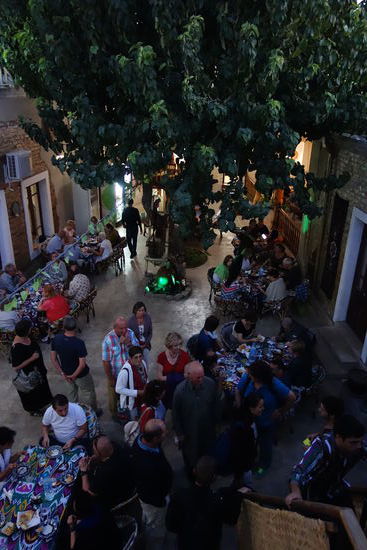 Doch weitgefehlt: wir halten gegenüber und werden im Kukaldosh-Hotel untergebracht. Wir kennen das New Moon zwar nicht, aber besser kann es eigentlich nicht sein. Zur Begrüßung gibt es zunächst von der Hausherrin einen Rotwein und 'Knabbergedöns' das ist gut so, denn zunächst schmeckt der Rotwein zu süß, doch mit hellen und dunklen Rosinen ist er genau richtig. Auch die weißen Erdnüsse finden bei allen Anklang – im Nu sind die drei Schälchen leer.