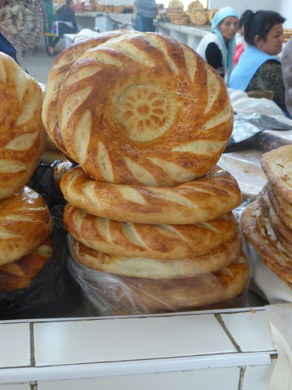 An der Stadtmauer entlang laufen wir bis zum Registan, der Hauptstraße in West-Ost-Richtung. Das Lokal, das Guide M. ausgesucht hat, ist schön gelegen, da es in den oberen Etagen einen Balkon hat und man auf den Platz unterhalb schauen kann, an dem die Mir-i-Arab-Medrese und die Kalon-Moschee mit einem 46 m hohes Minarett stehen. Am Ende des Registan befindet sich der Toki Sargaron, der Basar der Juweliere.