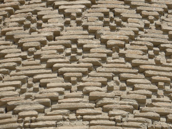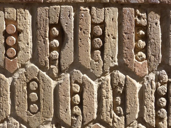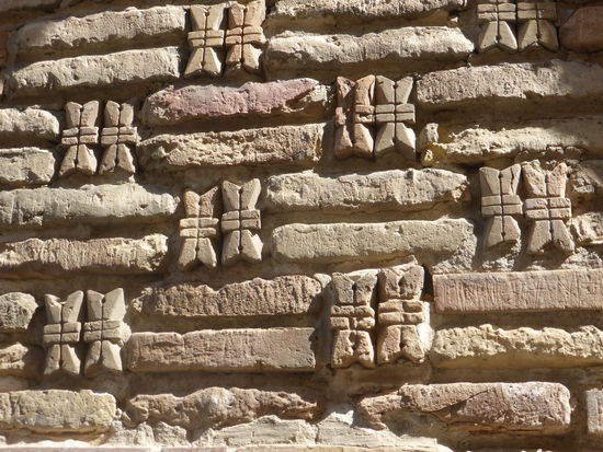 umlaufende Bänder geometrisch gesetzter Ziegel - 14 an der Zahl mit den verschiedensten Mustern - ganz oben ein Band glasierter Ziegel in Blautönen
