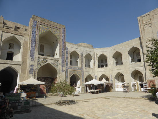 In den ehemaligen Studentenzellen haben Souvenirläden und Kunsthandwerker Einzug gehalten. Insgesamt wirkt diese größere wuchtigere Medrese uneinheitlich - durch die Verkaufsstände wird dieser Eindruck noch verstärkt.