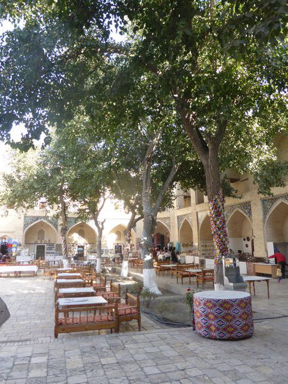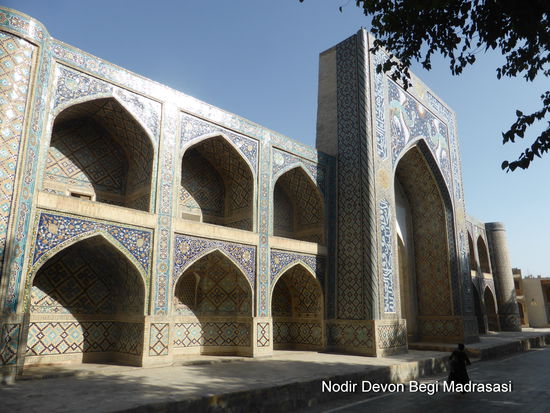 Auf der anderen Seite im Schatten der Maulbeerbäume des Labi Hauz liegt die Medrese Nadir Devon Begi. Die Geschichte des gesamten Ensembles ist untrennbar mit der Person des gleichnamigen Würdenträgers Nadir Diwan-Begi verbunden , der am Hofe des Imam Kuli-Khan (1611-1642) beschäftigt war.