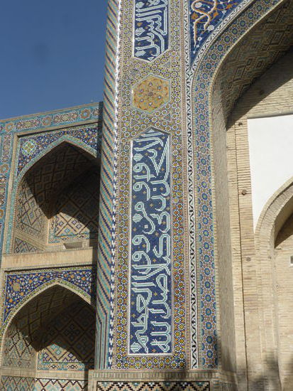 Ist die Kukeldash Medrese nahezu schmucklos, so ist die Fassade dieser Medrese fast schon überladen. Das kann seinen Grund in der Tatsache haben, dass Nadir Diwan-Begi die drei Jahre vorher gebaute Scher-dor-Medrese in Samarkand kopieren wollte, bei der Bildern von der Sonne, Tigern und Antilopen verwendet wurden, eine künstlerische Darstellung, die für die durch den Islam geprägte Kultur Zentralasiens neu war.