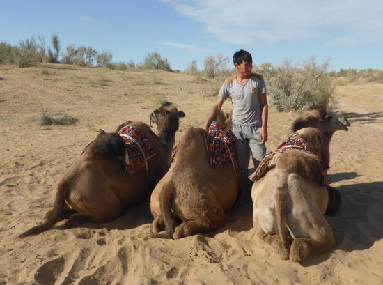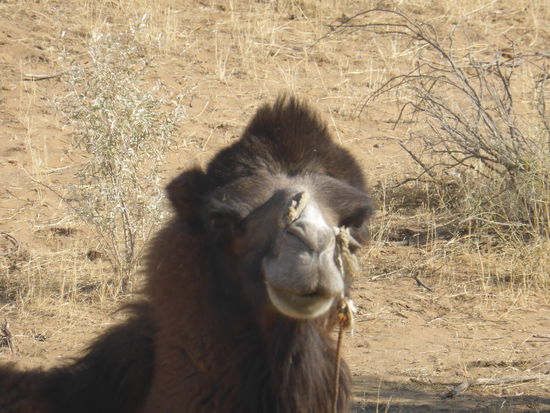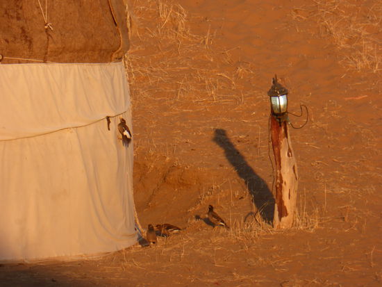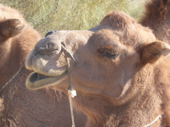 Um 8.00 Uhr gibt es Frühstück und danach ist Kamelreiten angesagt, ob ich mitmache, weiß ich noch nicht, meine Frau Ulrike hat sich bereits gegen die touristische' veranstaltung entschieden. Um 9.00 werden drei Kamele ‚vorgefahren’ und M., Th.und U. steigen auf. Ich soll als Hoffotograf Video und Fotos machen. Nach einer guten Viertelstunde kehren sie zurück und ich entscheide mich kurzfristig hinter E. und M. das dritte Kamel zu besteigen. Der Platz ist bedeutend bequemer als bei dem Dromedar in Rajasthan, nur das Bergab laufen ist nicht besonders angenehm. Mir gelingen sogar ein paar ‚Selfies’ mit dem Fotoapparat.