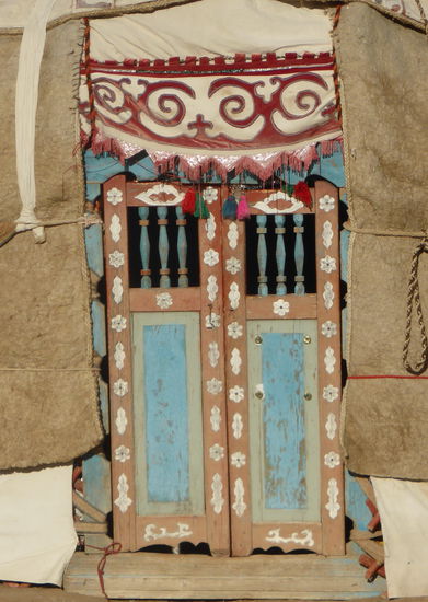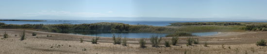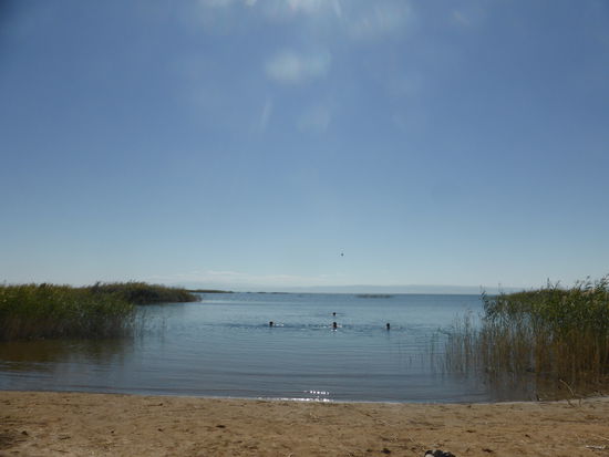 Der 240 km lange See scheint äußerst flach und sauber. Die meisten nehmen ein Bad, überwiegend textilfrei. (Schließlich sind ja auch einige ehemalige Ossis dabei). Derweil baut ein Angestellter des Jurtencamps ein Sonnendach auf, während Murad es sich auf einem Stuhl gemütlich macht. Erst nachdem ich anfange die Stühle aufzustellen, fühlt er bemüßigt mitzumachen.