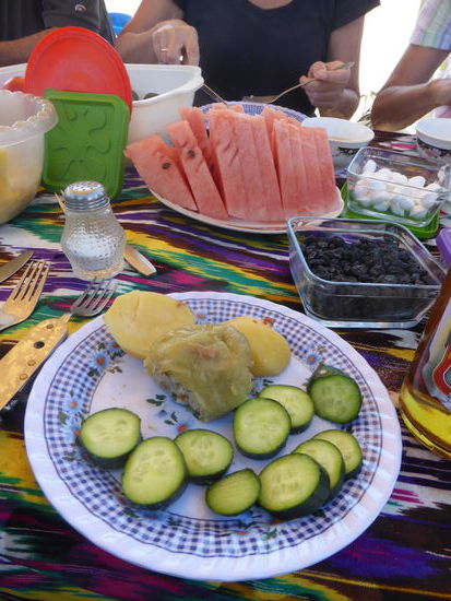 Es ist zwar erst kurz vor 12.00 Uhr und noch etwas früh fürs Mittagessen, aber es gibt ein komplettes einschließlich Bier aus usbekischen Tupperware-Dosen. Gegen 13.00 Uhr drängt M. zur Abfahrt, denn er weiß dass wir ca. 250 km vor uns haben. Den ersten Teil der Strecke bis Nurata kennen wir ja schon.