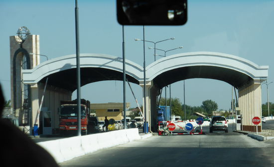 Aber dort fährt unser Bus weiter die Strecke rückwärts bis Noralje, wo wir gestern die Karawanserei besucht haben. Erst hier biegt er nach Osten ab. Kurz dahinter passieren wir – wieder mit einer pompösen Straßenkontrollstelle die Provinzgrenze zu Samarkand.