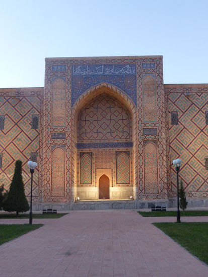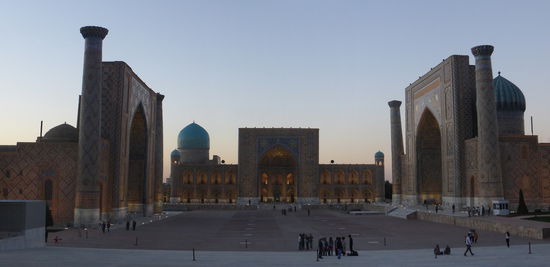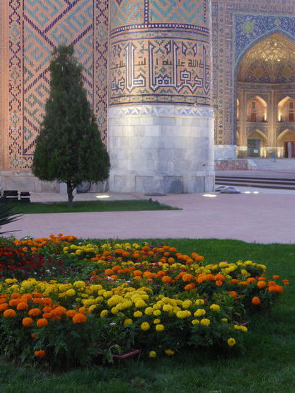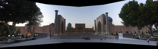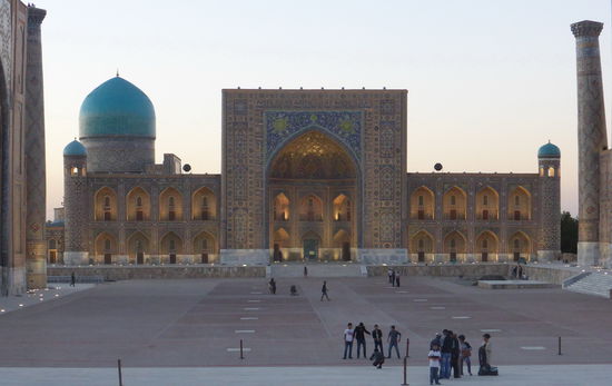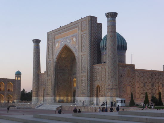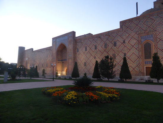 Wir ziehen Richtung Registan los und finden nicht auf Anhieb einen passenden Laden, aber das von mir ausgeguckte Lokal kommt auch nicht in Frage. Aber gut, dass wir losgezogen sind, denn wir sind in weniger als 10 min am Registan und können dort bereits eine erste Abendstimmung einsaugen.