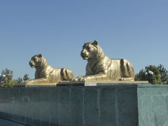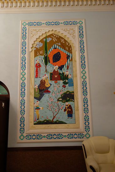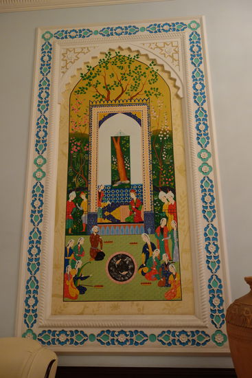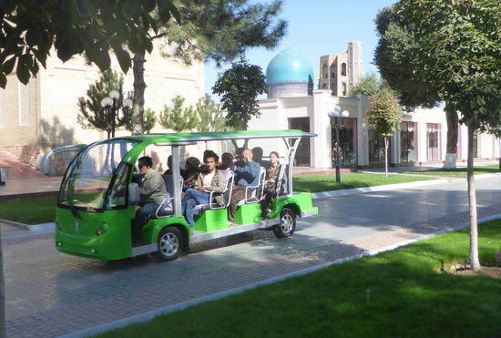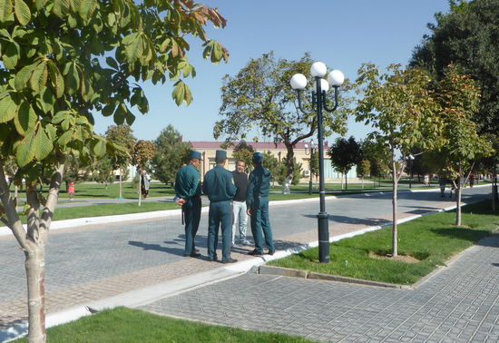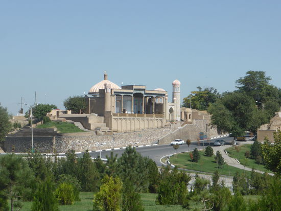 Am Ausgang ändert die Gruppe das Programm und will noch den Programmteil von morgen Vormittag abarbeiten, um wenigstens vormittags noch ein wenig zur freien Verfügung zu haben. Daher fahren wir wieder quer durch die Stadt zum Mausoleum Gur Emir, in dem neben Amir Temur auch Ulug Bek einen Sarkophag ‚stehen’ hat. Allmählich macht sich die Mausoleenmüdigkeit bei allen bemerkbar und vor allem hat niemand mehr Lust, den allmählich einsetzenden Bemühungen unseres Guides M. zu folgen. Auf dem Weg dorthin passieren wir einen schönen Park und die Statue des Amir Timur – das kann man morgen früh noch alles selbst in Augenschein nehmen. Um 17.00 Uhr beendet Murad den Stadtbesichtigungsteil und verkündet, dass uns morgen ein anderer Fahrer nach Taschkent bringt. (Na immerhin eine Info - aber dahinter steckt wahrscheinlich der Hinweis auf das fällige Trinkgeld)