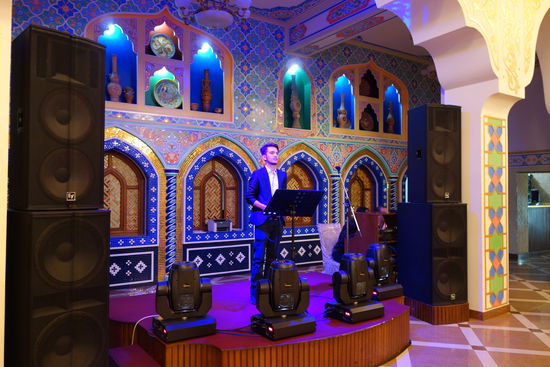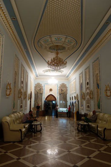 Man sitzt noch eine Weile nach dem Essen zusammen, ich bin müde und dann fahren wir mit dem Bus zum Hotel zurück, nachdem wir am Registan einen kurzen Stopp für Nachtfotos und ein Einatmen des Ambiente gemacht haben. In der Lobby sitzen reihenweise Leute und nutzen das Wlan, dessen Nutzung auf 15 Personen beschränkt ist und erklärt, daß E. und ich nicht hineinkönnen. So muß ich die Email an meinen LKW-Buchautor B. morgen früh schicken.