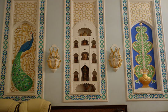 Von außen sieht da Lokal ansprechend aus; beim Betreten ist man erschlagen von den Dekorationen, eine Fülle von sehr schönen Motiven, die uns als Miniaturen die ganze Reise über begleitet haben, zieren den langgezogenen Eingang.
