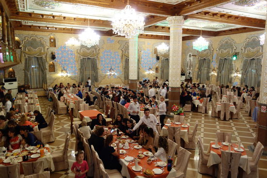 Unterhalb der Hazrat-Xizr-Moschee, die zwar attraktiv auf einem Hügel liegt, aber nicht zu unserem Besichtigungsprogramm gehört, steht unser Bus, der uns quer durch die Stadt mit z.T. eindrucksvollen Bauten zu dem bereits gestern empfohlenen Lokal Platan fährt, wo wir – vielleicht aufgrund des geringen Umsatzes – etwas muffelig bedient werden.