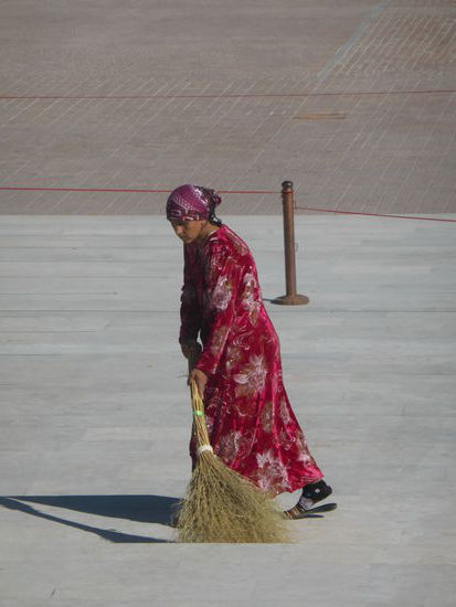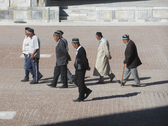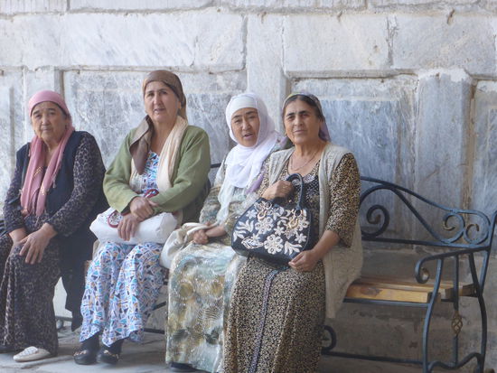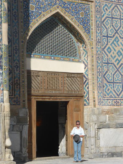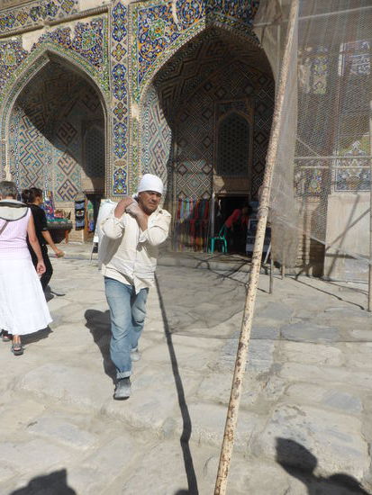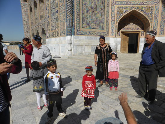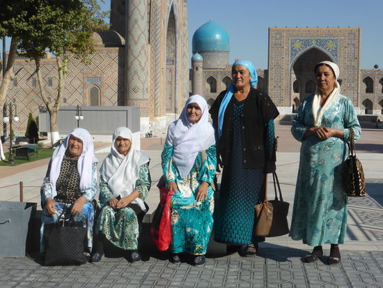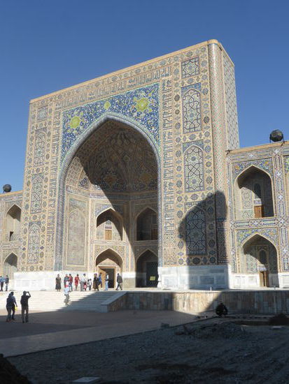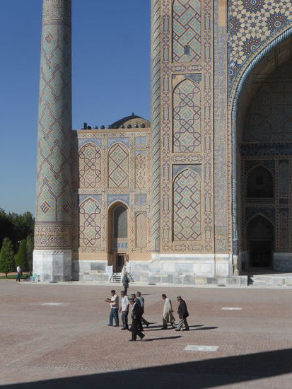 Nach ausgiebigem frühen Frühstück – WLAN gibt es nur in der Lobby, wie auch im Asia Bukhara – starten wir und werden mit dem Bus zum Registan (600m!) gebracht. Dort stehen drei Medresen unterschiedlichen Alters um einen quadratischen Platz, dem Registan oder übersetzt 'sandiger Platz' aus der Timuridenzeit. Der Platz wurde für politische Versammlungen, Paraden, öffentliche Akte wie Verkündigung von Gesetzen und Erlassen, Bestrafungen, Hinrichtungen etc. benutzt. Wenn kein öffentlicher Anlaß war, fand hier früher reges Markttreiben statt. Heute ist er eher verwaist, nur vereinzelte Personen, die Eintritt bezahlt haben, können ihn betreten.