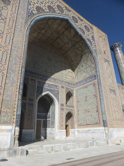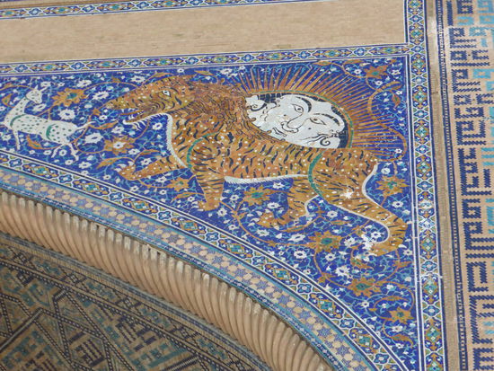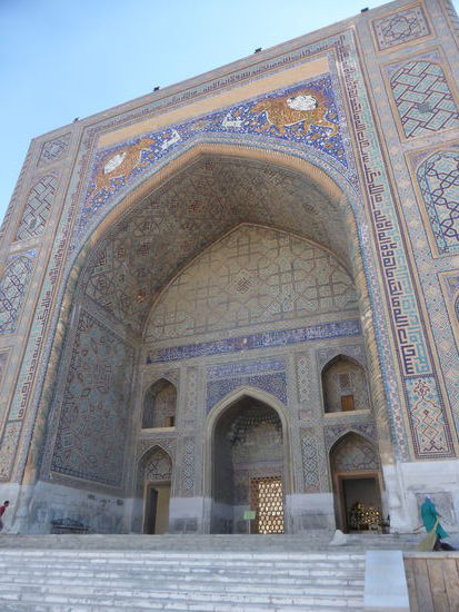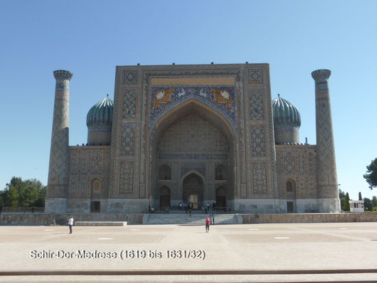 Die Medrese Shir-Dor („Besitzer des Tigers") wurde auf Kosten des Emirs Jalangtut-bij errichtet. Das Vorderportal ist mit einer Mosaikdarstellung von zwei aufeinanderzuspringenden Tigern geschmückt. (daher der Name)