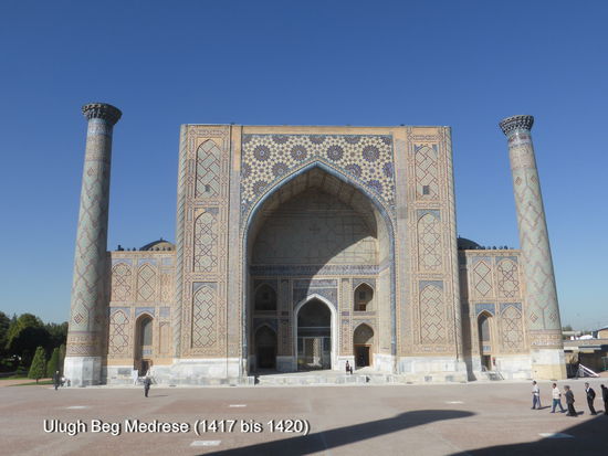 Wenn man wieder auf dem Registan steht, sieht man genau gegenüber eine zweite fast baugleiche Fassade, nämlich die der Ulugh Beg Medrese (1417 bis 1420). Nach dem Kosh-Prinzip stehen die Eingangs-Iwane genau gegenüber, beide mit flankierenden Minaretten an den Ecken des Gebäudes, beide mit Kuppelräumen in den Ecken rechts und links des Eingangs-Pishtaqs, beide mit quadratischem Innenhof und mit Studentenzellen auf zwei Stockwerken, beide dem Vier-Iwan-Schema folgend. Auch wenn sie nahezu identisch sind, trenn sie mehr als 2 Jahrhunderte. Die Ulug-Bek-Medresse ist nach der Geschlossenheit ihrer Formen, aufgrund ihres monumentalen Charakters und ihrer künstlerischen Gestaltung ein klassisches Beispiel für die Baukunst der ersten Hälfte des 15. Jahrhunderts. Sie ist Teil des kostbaren nationalen Architekturerbes. (Der Registan ist inzwischen auch Weltkulturerbe)