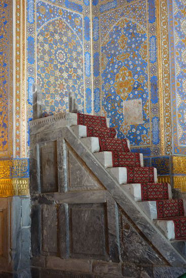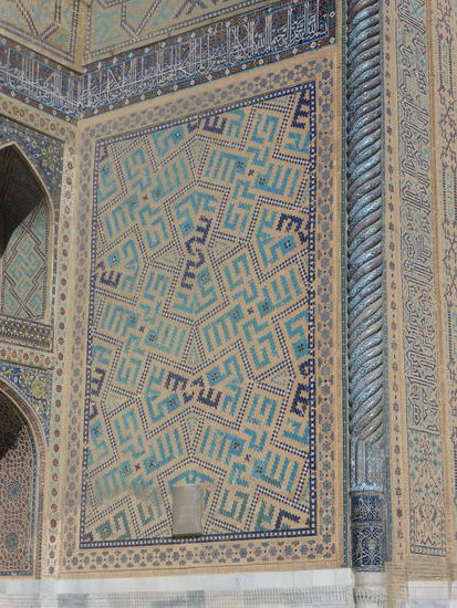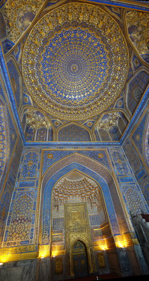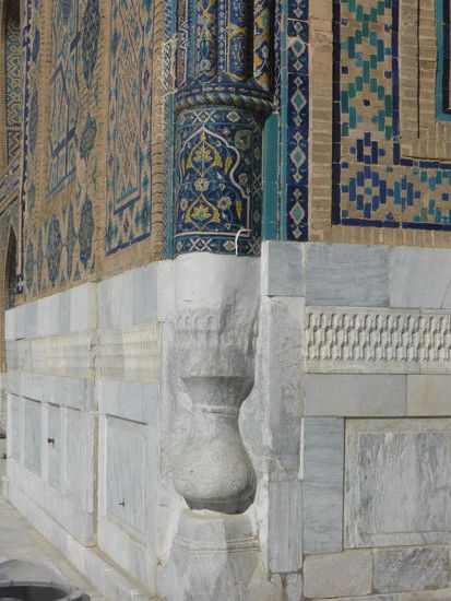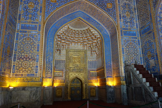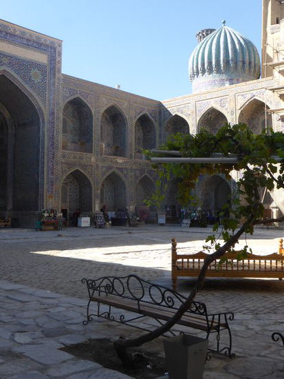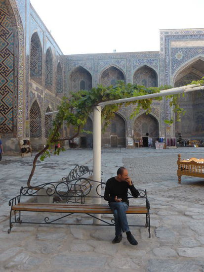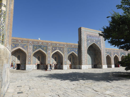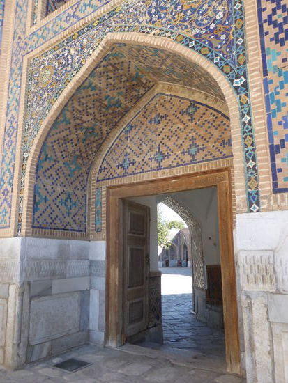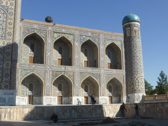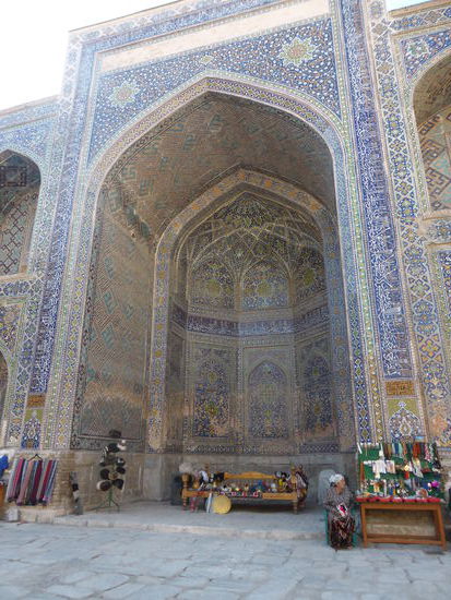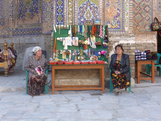 Wir besichtigen alle drei – zuerst die rechte Shir-Dor-Medrese (1619-1631) – dann die mittlere und jüngste Tillakori-Medrese (1641-1660), sie gefällt uns vom Flair und Ambiente am besten. Leider ist in allen Souvenir-Verkauf, mal dezent mal weniger.
