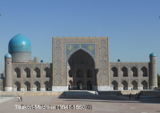 An der dritten Seite des Platzes fällt die zweirangige Bogenreihe der langen Vorderseite der Medrese Tillja-Kari („Die mit Gold Ausgekleidete") ins Auge, die ebenfalls Jalangtut-bij errichten ließ. Tillja-Kari ist heute wie früher die Hauptmoschee der Stadt.