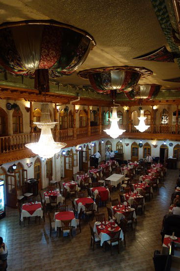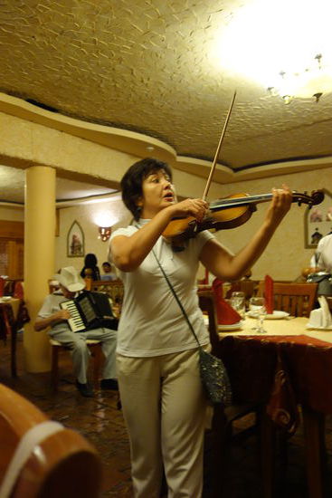 Neben uns hat eine usbekische Geburtstagsgruppe Platz genommen. Das sollte sich für den Nachtisch als Glücksgriff erweisen, da wir noch Torte abbekommen. Außerdem spielt eine kleine Kapelle auf.