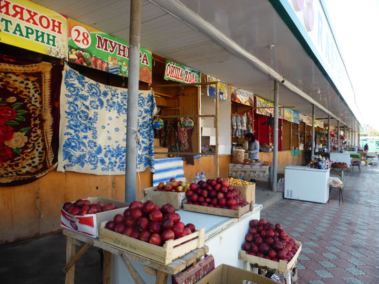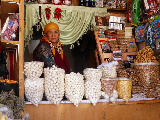 Die Paßhöhe geht auf ca. 2200m Höhe an kahlen abgerundeten Hügeln vorbei. LKW und PKW werden getrennt und fahren unterschiedliche Straßen, die PKWs offensichtlich die schlechtere Straße, obwohl wir nun im PKW sitzend die Probleme unseres Busses der letzten Tage schnell vergessen. Leider bemerke ich zu spät eine Ansammlung von primitiven Zelten mit Ziegen, aber Feruza registriert sofort, dass ich auch anderen Stellen rinmal anhalten möchte.. Das tun wir dann an einer Reihe Marktständen, wo ich den getrockneten Joghurt wieder probieren darf und Feruza uns auch eine spezielle Dattelart sowie winzig kleine Äpfelchen (oder ist das eine unangebrachte Tautologie?) zeigt.