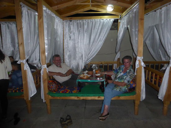 Zuerst kommt die Soljanka, dann der Spieß – lecker aber z.T. hartes Fleisch und als Ulrike meint, dass man wohl den Salat vergessen hat, und wir uns schon seit geraumer Zeit mit einem Usbeken unterhalten, der stolz verkündet, dass er in Belgien Apfelbäume gekauft hat und hier angepflanzt hat und – nach seiner Visitenkarte – Direktor von Äpfelvertrieb in Fergana ist, kommt der Salat doch noch. Frisch zubereitet ist er sehr lecker und ähnelt etwa dem 'ensalada rusa' in Spanien. Der Boß erzählt uns dann, dass morgen das Opferfest ist und man dann den Nachbarn Portionen Essen kostenlos gibt, was er auch mit uns machen will. Obwohl gesättigt, kommt dann noch ein Teller mit Plov mit Huhn. Aus Höflichkeit essen wir jeder noch eine reichliche Portion, schaffen den Teller aber nicht ganz. Mehr als gesättigt, hätten wir durchaus ein Wodka vertragen können.