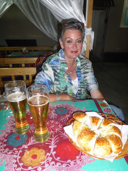 Als wir uns aufmachen ist es schon dunkel und die Straße nicht beleuchtet. Wir tasten uns in Ermangelung einer Taschenlampe langsam vor und finden an der Straße das Café mit vier Sitzplateaus. Das gezapfte Bier nach dem wir lechzen, kostet hier nur 2500 Sum (0,50€ für 0,5 Liter), dagegen erscheinen die Preise für die Speisen im Verhältnis recht teuer. Wir bestellen wieder einen Salat, eine Suppe und eine Hauptspeise.