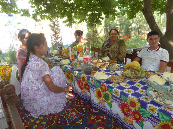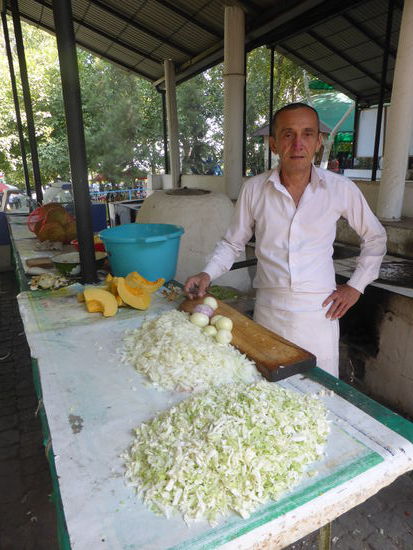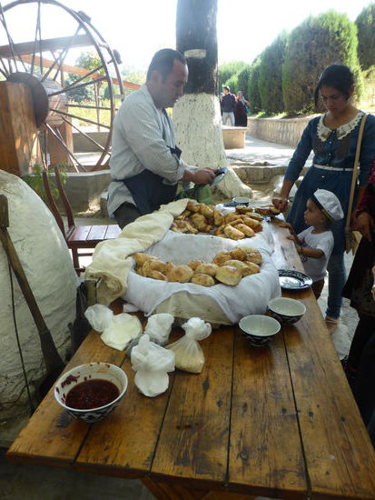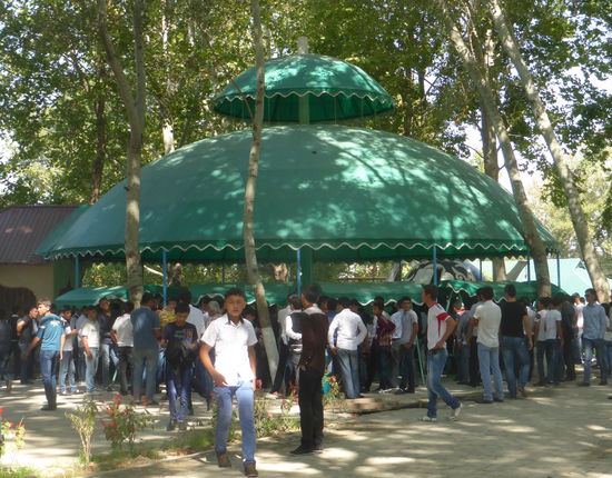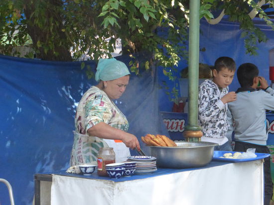Im Bobur Park stehen viele überdachte Pavillons, die Familien mieten können, um in speziellen Nischen zu kochen und dann ein Picknick zu veranstalten. Da es noch früh am Morgen ist, sind nur vereinzelt schon Leute dabei, das Feuer anzuzünden oder das Gemüse zu schneiden.