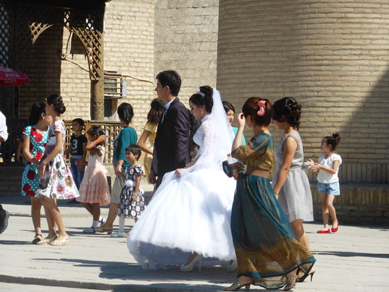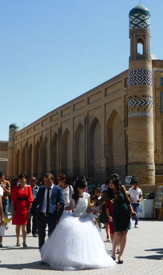 Unzähligen Brautpaare schreiten in wunderschönen Kleidern und festlichen Anzügen durch die Gassen, denn Chiwa ist ein besonderer Ort, um sich trauen zu lassen. Nach der Trauung gehen die Hochzeitsgesellschaften in das Pahlavon-Maxmud-Mausoleum, um dort zu beten und im Innenhof das Wasser des heiligen Brunnens zu trinken.