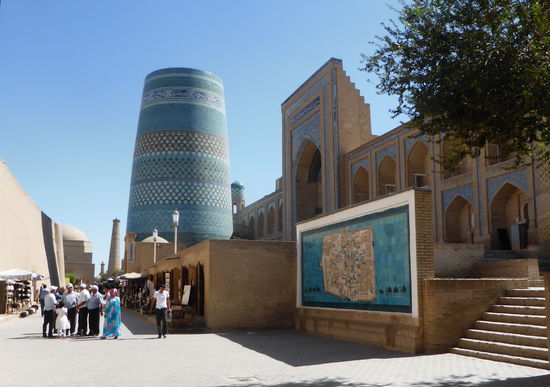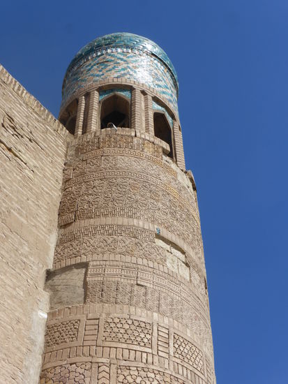 Doch nun zu den ersten Eindrücken - Kalta Minor heißt kurzes Minarett. Es sollte jedoch das höchste Minarett des muslimischen Ostens werden, konnte aber aufgrund statischer Probleme nicht weitergebaut werden. Überhaupt erscheint mir in Chiwa vieles schief zu stehen - Kommentar eines Mitreisenden: daher heißt es ja auch Chiva und nicht Senkrechta.