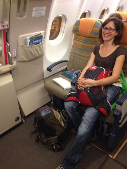 Vor unserer Abreise treffen wir uns in Zuerich mit Katja und Christian zum Essen, die uns dann auch bis zum Flughafen begleiten. Wir vermuten, sie wollen sicher gehen, dass wir auch bestimmt in das richtige Flugzeug steigen. Tatsaechlich aber besorgen sie uns die besten Plaetze, gleich beim Notausgang, mit garantierter Beinfreiheit. Herzlichen Dank fuer dieses Hochzeitsgeschenk!