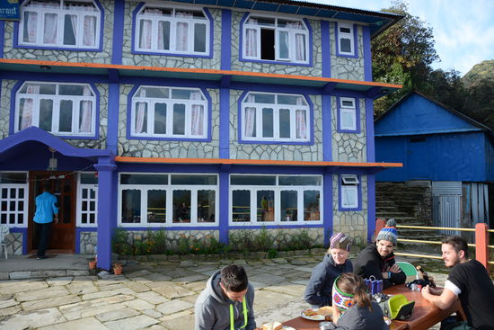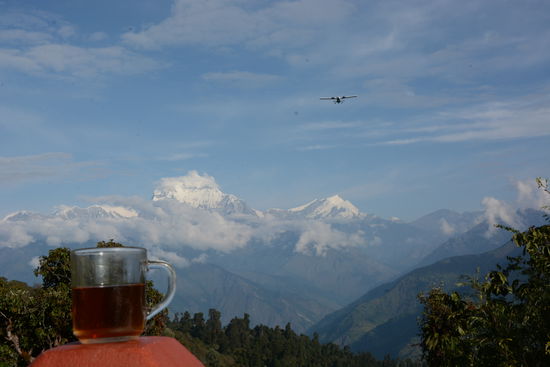 Waehrend dem Fruehstueck (Breakfast-Set 1) verziehen sich die Wolken und der Annapurna Sued zeigt sich in voller Pracht. Heute fliegen auch die vielen kleinen Flugzeuge von Jomosom nach Pokhara, direkt ueber unsere Koepfe.