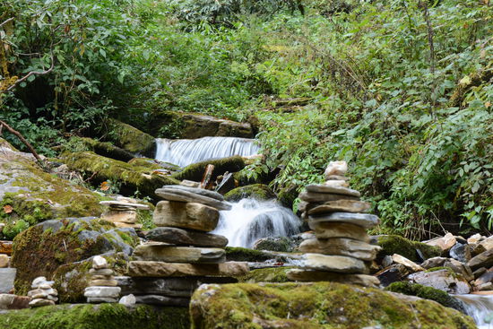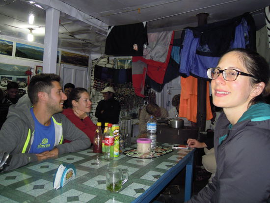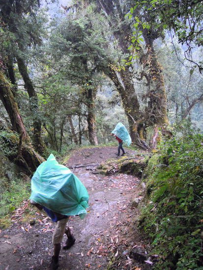 Kurz vor dem Anstieg nach Tadapani (die letzten 500m Hoehendifferenz) erwischt er uns mit heftigem Regenfall. Der Weg verwandelt sich in Nullkommanichts in einen Bach und wir suchen im erstbesten Guesthouse Unterschlupf. Leider gibt es hier keine freien Zimmer mehr. Aber genug andere Lodges. Die unsere sogar mit heissem Duschwasser! Das tut gut...