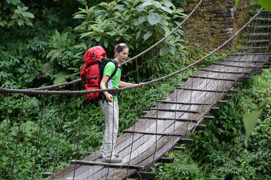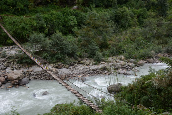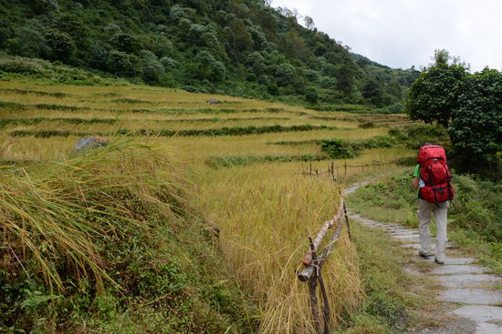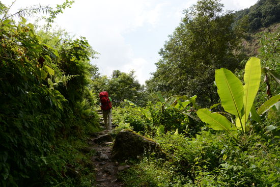 Nach dem ermuedenden Aufstieg zum Guesthouse zurueck, staerken wir uns mit Breakfast-Set 1 und nehmen die Route in Angriff. Wir kreuzen viele Einheimische, die ungeheure Lasten nur mit Baendern auf ihrer Stirn schleppen. Wir wissen nicht genau bis wohin wir heute marschieren und entscheiden von Dorf zu Dorf. In Landruk treibt uns der Regen zum Mittagessen. In Tolka entscheiden wir uns spontan zu bleiben, einerseits wegen dem naeherkommenden Gewitter und andererseits fuehlt sich Pascal nicht sonderlich wohl.