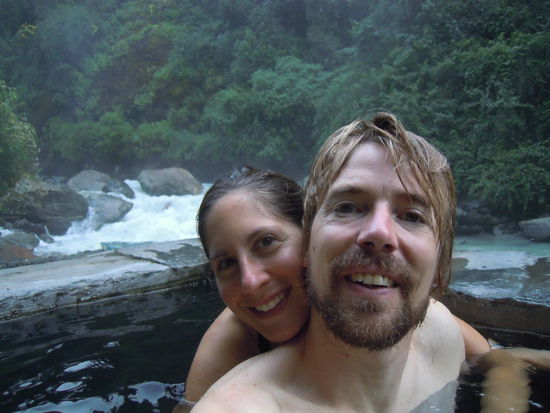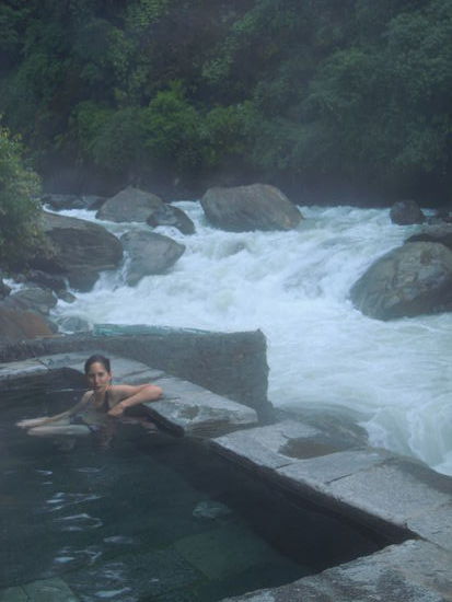 Am fruehen Morgen um 6.30 steigen wir zu den bekannten heissen Quellen hinab. Das Aufstehen hat sich gelohnt! Wir sind die Ersten und haben ein Becken fuer uns alleine.