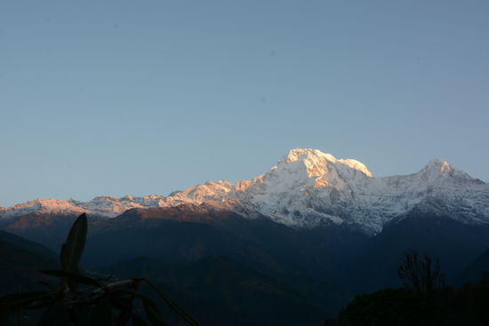 Der Annapurna Sued begruesst uns voellig wolkenfrei und der Sonnenaufgang ist einfach nur schoen. Nach und nach wird jede Flaeche des Riesen mit Sonnenstrahlen beschienen und wir stellen uns vor, wie jetzt vielleicht in genau diesem Moment ein Bergsteiger den Gipfel erreicht.