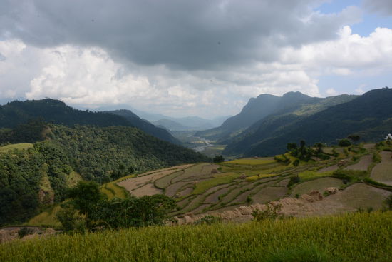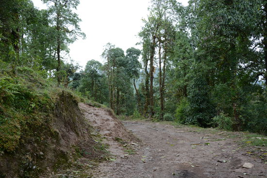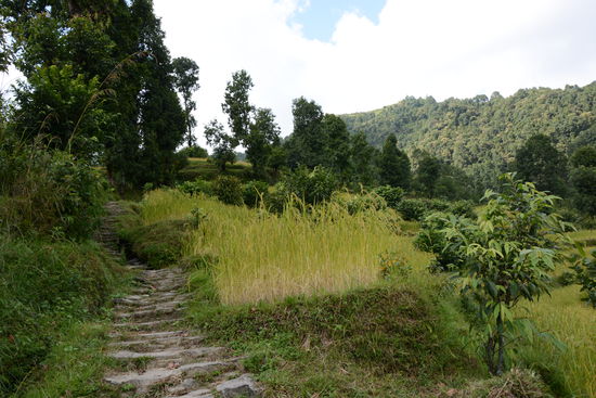 Eigentlich haben wir Nayapul als Endstation anvisiert, aber irgendwie haben wir wohl die richtige Abzweigung verpasst, weil die breite Strasse so angenehm zum marschieren ist. Die Steintreppe hoch ueber den Bhichok Deurali wollen wir nicht gehen -genug ist genug-, darum folgen wir einfach der Strasse. Die fuehrt uns dann nach Pothana. Also aendern wir unsere Endstation kurzerhand und wollen in Phedi einen Bus erwischen. In Pothana legen wir wegen Regen eine Pause ein, der will aber nicht so recht aufhoeren. So montieren wir in geuebten Handgriffen die volle Regenkleidung und gehen weiter nach Dhampus. Nach dem TIMS-Check-Point (wir sind nun wieder ausserhalb des Annapurna-Conservation-Areas) prasselt der Regen unaufhoerlich auf unsere Koepfe. Schnell sind wir pitschnass, geben aber nicht auf und siehe da: 10 Minuten spaeter, immer noch in Dhampus, trocknet die Sonne saemtliche Regentropfen in Rekordzeit.