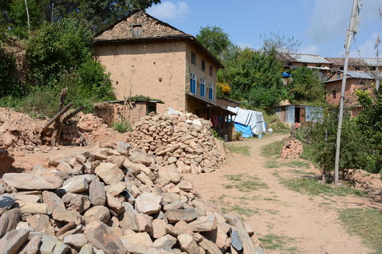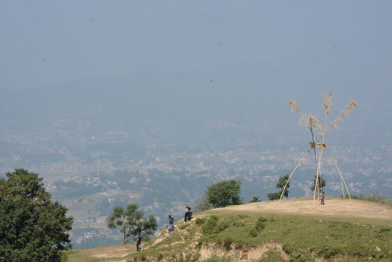 Der Weg fuehrt uns durch einen Nadelwald, vorbei an Doerfern und Tempeln und natuerlich treffen wir wieder auf die heissgeliebten Treppen. In jedem Dorf sind die Bambus-Schaukeln in Betrieb und die Kinder geniessen die letzten Tage des Dashainfests. Die Natur zeigt sich bunt und vielseitig, wir sind begeistert! Aber die Zerstoerung des Erdbebens wird uns hier wieder so richtig vor Augen gefuehrt. Viele Haeuser sind eingestuerzt und die Menschen leben in den bereits erwaehnten Huetten. Solange kein Geld zum Wiederaufbau vorhanden ist, aendert sich nichts an ihrer Situation. Eigentlich gibt es auf dem Weg mehrere Einkehrmoeglichkeiten, leider allesamt geschlossen. Ob wegen dem Dashainfest oder der Touristenflaute wissen wir nicht.