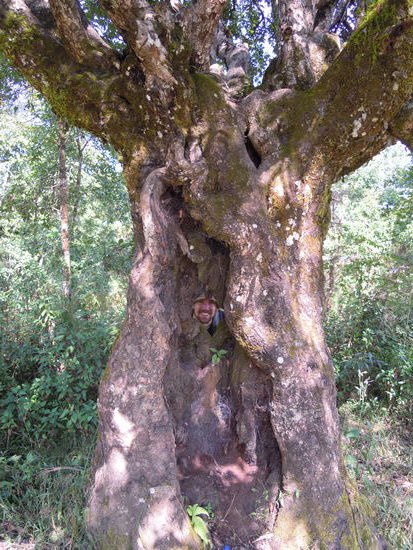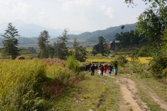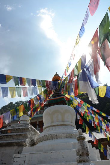 Die drittheiligste Staette des Buddhismus wollen wir auch noch betrachten. Der Weg ist einfach zu finden, dank guter Beschilderung. Es ist unglaublich, aber auch hier fuehrt die Steintreppe am schnellsten ans Ziel. Die Dorfkinder wollen wie gewohnt Suessigkeiten oder Schokolade von uns haben und wir geben ihnen Bananen. Der letzte Wegabschnitt fuehrt ueber den Bergkamm und von Weitem sehen wir schon die goldenen Daecher des Klosters im Sonnenlicht glitzern. Direkt neben der Stupa essen wir feine Thukpa und Momos, bevor wir uns an den Abstieg ueber Sankhu und Ite nach Dhulikel zurueck machen. Ueberall sehen wir kleine Hindu-Staetten, wo waehrend des Dashainfests bunte Gaben deponiert werden.
