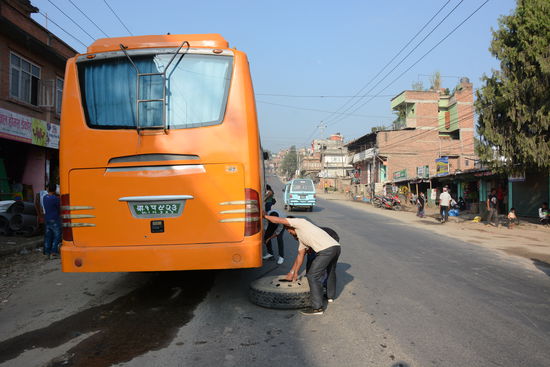 Immer vor den Linkskurven wird gehupt, um ein allfaelliges Kreuzen bei voller Fahrt zu ermoeglichen. Eine zusaetzliche Pause erleben wir beim Garagisten, der bei vollem Bus mal schnell einen Pneuwechsel vornimmt.
